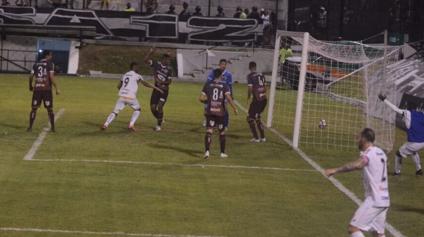 Aos 18 minutos Felipinho errou duas vezes. Na segunda entregou no pé de Matheuzinho. O camisa 10 dominou e mandou um chutaço em direção ao gol. Welligton saltou e desviou para escanteio.