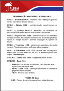 A programação celebrativa inclui uma reunião com os amigos do ALBEM para prestação de contas e lançamento do Projeto Konstelação. Além disso, dentro desse período de celebração, será feito o lançamento do site oficial, uma ação de incentivo no Ateliê do Bem, exposição cultural, bem como ações voltadas para os albergados e para as equipes de colaboradores.