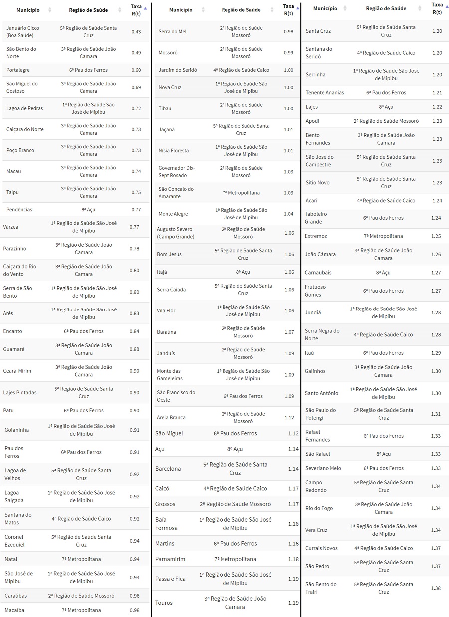 O Rio Grande do Norte conta com apenas 39 cidades com situação confortável em relação à taxa de transmissibilidade, sendo que 35 estão classificadas como em Zona Segura (e onde estão 1.745.065 pessoas) e 4 estão em Zona Neutra (onde vivem 152.172 habitantes).