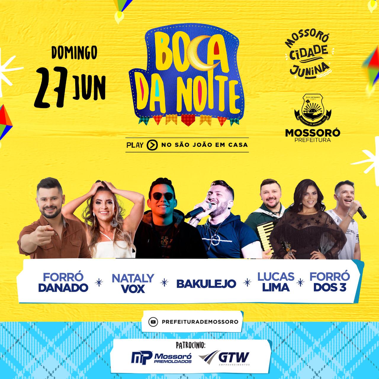 No Polo Cidadela, no palco do Teatro Municipal Dix-huit, se apresenta Forró Danado abrindo a live. Em seguida, quem comanda a festa é Nataly Vox no palco do Teatro Lauro Monte Filho. Bakulejo e Lucas Lima também farão shows. O encerramento do Boca da Noite fica por conta do Forró dos 3. Os shows são transmitidos ao vivo no canal da prefeitura no YouTube: https://www.youtube.com/prefeiturademossorooficial.