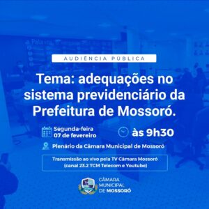 A Câmara Municipal de Mossoró vai realizar uma audiência pública para debater as adequações no sistema previdenciário da Prefeitura de Mossoró, na segunda-feira, 07 de fevereiro, às 9h30 da manhã. A iniciativa da audiência é do vereador professor Francisco Carlos (PP).