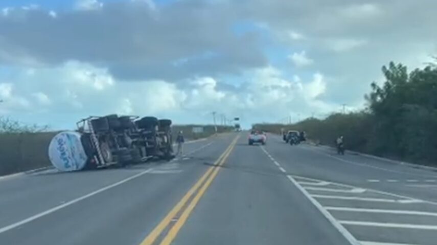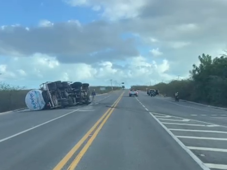 Um caminhão-tanque carregado com água potável tombou na madrugada desta quinta-feira (6) na BR-110, em um trecho conhecido como “trevo de Golinha”, no município de Areia Branca, no Oeste potiguar.