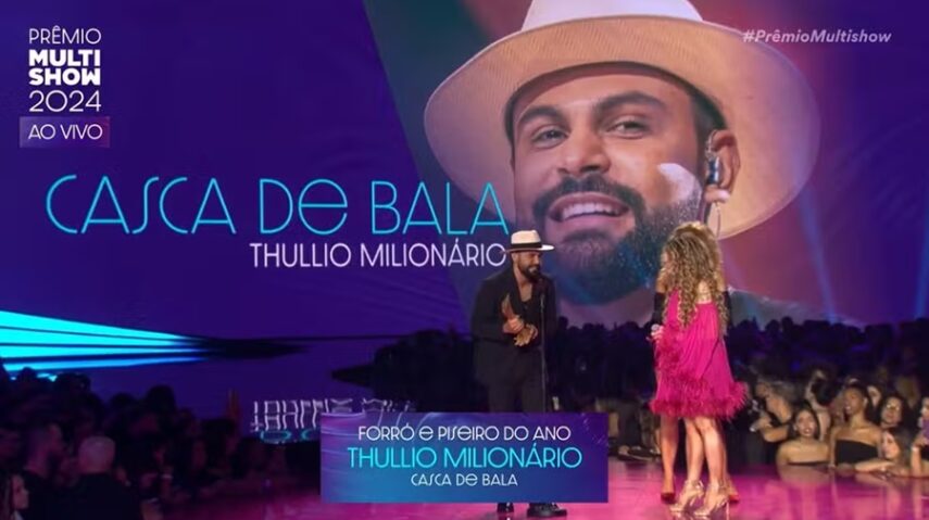 O cantor potiguar Thullio Milionário venceu o Prêmio MultiShow 2024 com a música ‘Casca de Bala’, que foi indicada na categoria Gênero Musical ‘Forró/Piseiro do Ano’.