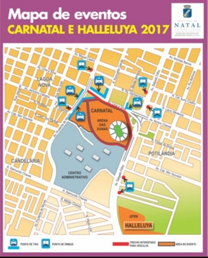 A Secretaria Municipal de Mobilidade Urbana (STTU) definiu a operação de trânsito e transporte para o Carnatal e o Halleluya, respectivamente. A micareta acontece entre os dias 7 e 10 de dezembro no Arena das Dunas e o evento Halleluya acontece na Praça Cívica do Campus, no período de 8 a 10 de dezembro.
