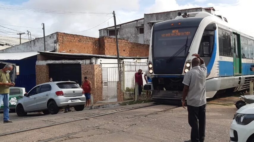 Um carro foi atingido por um trem na tarde desta quarta-feira (16) em uma linha férrea no bairro das Quintas, na Zona Oeste de Natal. Ninguém ficou ferido no acidente.