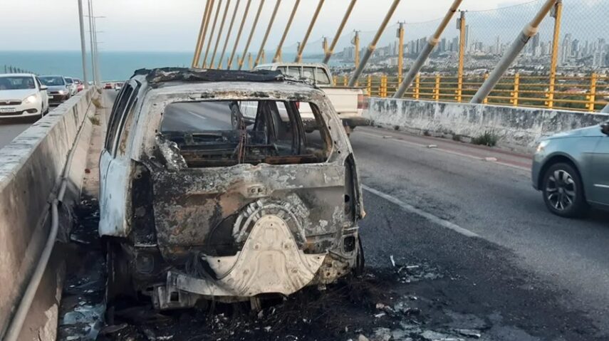 Um veículo ficou destruído após pegar fogo na tarde desta terça-feira (26) em cima da Ponte Newton Navarro, que liga as zonas Leste e Norte de Natal. Ninguém ficou ferido.