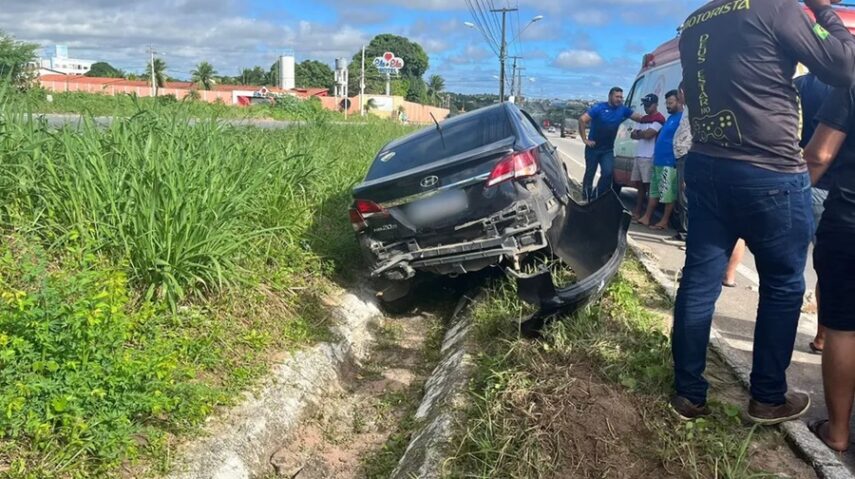 Um carro que freou para parar atrás de outro em uma faixa de pedestres na BR-406, no sentido de Natal e Ceará-Mirim, foi atingido por um terceiro veículo e acabou caindo em uma vala no canteiro central da via. O caso aconteceu na manhã desta quarta-feira (14) na altura do quilômetro 170.