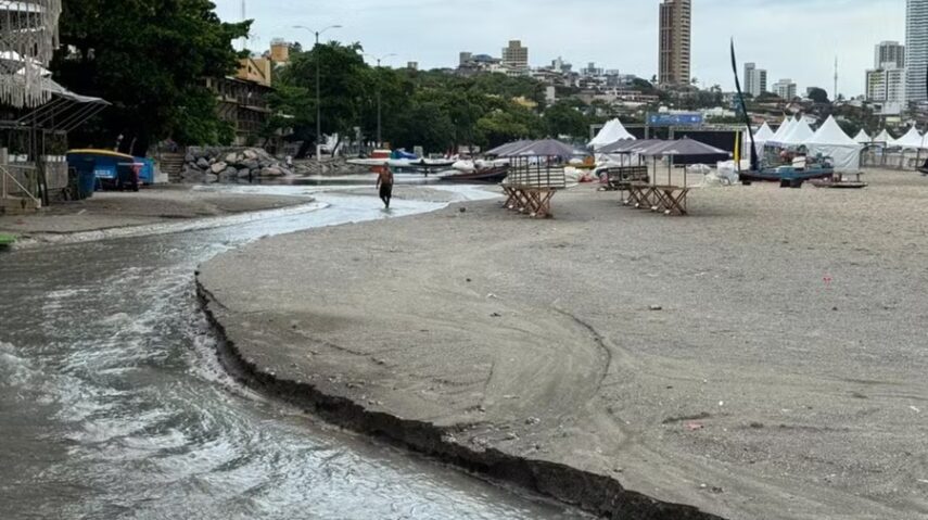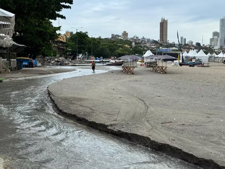 A água que desceu em direção à orla não só abriu a vala na areia, mas também provocou pontos de alagamento em toda a faixa de areia, surpreendendo turistas e moradores.