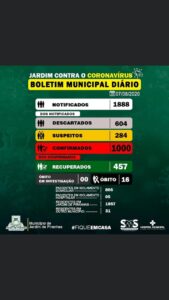 A Secretaria Municipal de Saúde de Jardim de Piranhas já contabiliza 1.888 notificações por causa da Covid-19. Dessas, 604 foram descartadas, ou seja, os exames não confirmaram as suspeitas. Os recuperados somam 457. Das pessoas com diagnóstico positivo da doença, 806 estão em isolamento domiciliar e outras 5 estão internadas.