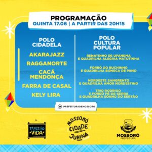 A programação do Mossoró Cidade Junina 2021 Virtual será retomada amanhã, 17, nos polos Cidadela e Cultura Popular. Os festejos juninos de Mossoró serão reiniciados com a apresentação de vários artistas da terra que prometem levar muita música, animação e alegria para os mossoroenses. As apresentações serão transmitidas pelo canal oficial da Prefeitura de Mossoró no YouTube: https://www.youtube.com/prefeiturademossorooficial.