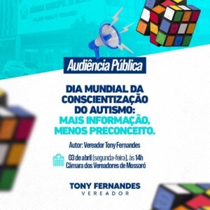 No Legislativo mossoroense o vereador Tony preside a Comissão de Defesa dos Direitos Humanos da Mulher, da Criança, do Adolescente, do Idoso e da Pessoa com Deficiência. “Muito me honra convidar nossos munícipes para participar dessa Audiência Pública que terá como tema o Dia Mundial da Conscientização do Autismo: mais informação, menos preconceito”, convida o edil. A presença dos interessados em participar pode ser confirmada pelo e-mail: ver.tonyfernandes@gmail.com.