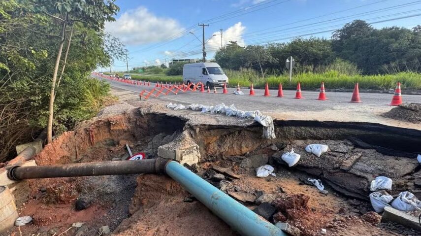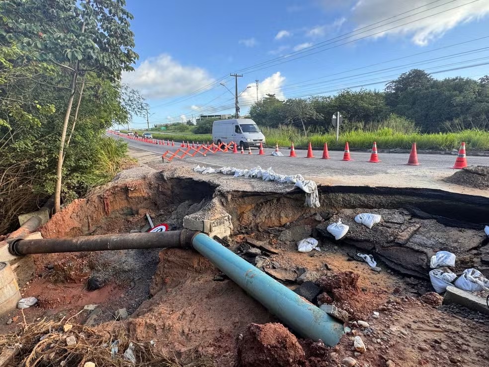 Uma cratera se abriu e causou a interdição de uma faixa da rodovia BR-406 na altura do km 169, em São Gonçalo do Amarante, na Grande Natal. O incidente ocorreu nesta terça-feira (24) após o rompimento de uma tubulação de água às margens da estrada, provocando erosão no solo.