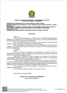 O deferimento costa de sentença do juiz eleitoral Vagnpos Kelly Figueiredo de Medeiros, da 34ª Zona Eleitoral, datada desta quinta-feira, 8 de outubro e divulgada hoje, 9/10. Também já consta no sistema eletrônico do Tribunal Regional Eleitoral (TRE/RN).