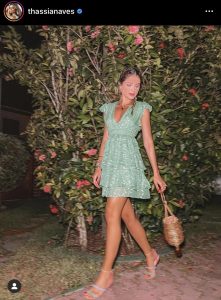 Decote V, cintura marcada e babados: vestidinho fofo, levinho e super fresco pra curtir numa boa, escolha da nossa musa Thassia Naves.