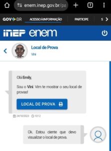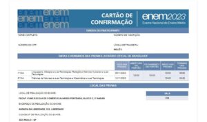 No cartão de confirmação, é possível conferir informações importantes para os dois dias de prova (veja exemplo abaixo). Apesar de a impressão do documento não ser obrigatória, a recomendação do Inep é imprimir e levar o cartão nos dias de exame (5 e 12 de novembro). Assim, o candidato evitará confundir o endereço onde prestará o Enem.