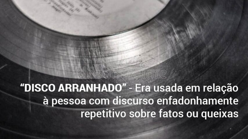 A expressão “disco arranhado” era usada em relação à pessoa com discurso enfadonhamente repetitivo sobre fatos ou queixas. A comparação era com os antigos discos de cera e depois de vinil, nos quais pequenas avarias ou arranhões impediam a progressão da agulha de cristal que propiciava a reprodução da música gravada, levando à repetição monótona de um trecho da gravação até que alguém resolvesse o engancho com um toque sutil no braço da radiola, suficiente para vencer o obstáculo sem perda relevante da continuidade da execução. A expressão findou junto com os discos.
