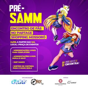 No sábado, 24/09, a partir das 14h acontece o encontro Pré-SAMM de fãs da Convenção Pop SAMM 2022.2 evento este que trará para a cidade nomes como Manolo Rey, dublador de personagens como Homem-Aranha, Agumon (Digimom), Robin (Teen Titãs), Gaguinho (Looney Tunes), entre outros. O encontro de prévia que acontece no shopping contará com a apresentação livre de cosplayers e apresentações de kpop solo e para duplas, todos com premiação. Haverá também a interação com jogo ‘Just Dance’ e sorteios para o público.