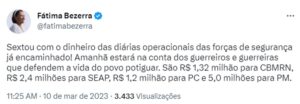 “Sextou com o dinheiro das diárias operacionais das forças de segurança já encaminhado! Amanhã estará na conta dos guerreiros e guerreiras que defendem a vida do povo potiguar. São R$ 1,32 milhão para CBMRN, R$ 2,4 milhões para SEAP, R$ 1,2 milhão para PC e 5,0 milhões para PM”, afirmou a governadora em sua conta no Twitter.
