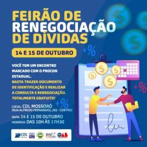 Consumidores mossoroenses terão a oportunidade de renegociar contratos e débitos em aberto no Feirão de Renegociação de Dívidas nos dias 14 e 15 de outubro, promovido pela CDL Mossoró, Procon Estadual, Defensoria Pública do RN e OAB/RN. O atendimento presencial com as quatro instituições envolvidas ocorrerá na CDL (Rua Alfredo Fernandes, 292 – Centro), das 10h às 17h30. O serviço é gratuito e basta levar documento de identificação.