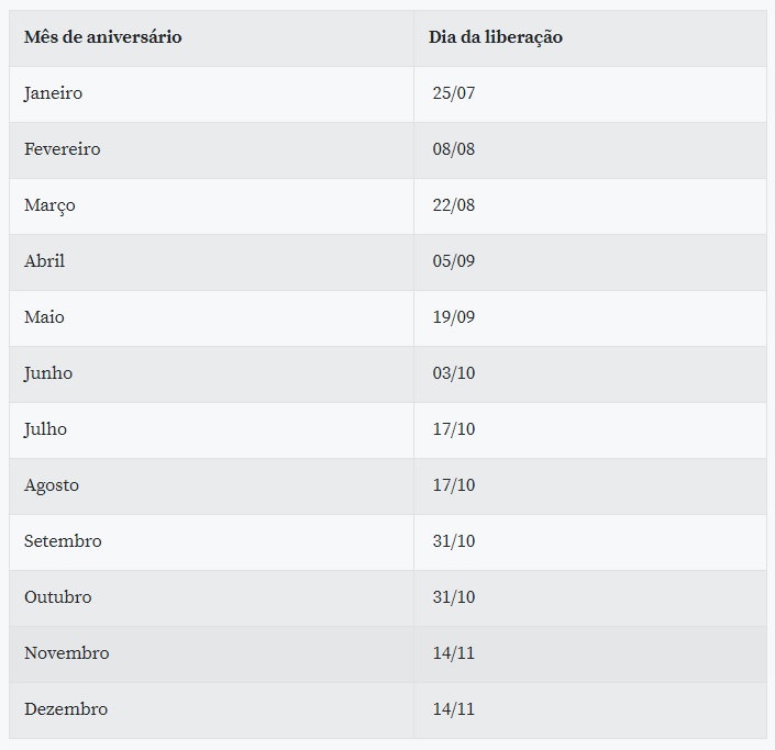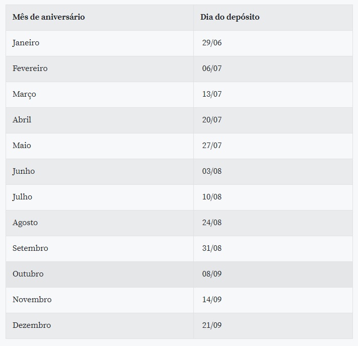 O processo envolverá dois calendários: um de crédito em conta e outro de saque. O primeiro procedimento será realizado semanalmente, às segundas-feiras, começando no dia 29 de junho e indo até 21 de setembro. A exceção será o dia 8 de setembro, terça-feira, em função do feriado da independência.