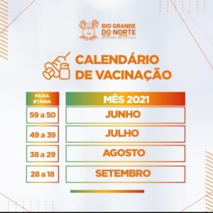 O Governo do Estado do Rio Grande do Norte divulgou calendário de vacinação contra a covid. O cronograma veio a público após a governadora Fátima Bezerra (PT/RN) anunciar que o Estado espera concluir até o mês de setembro a imunização de adultos até os 18 anos.