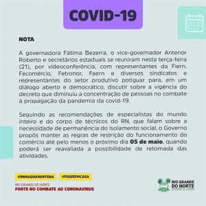 Seguindo as recomendações de especialistas do mundo inteiro e do corpo de técnicos do RN, que falam sobre a necessidade de permanência do isolamento social, o Governo propôs manter as regras de restrição do funcionamento do comércio até pelo menos o próximo dia 05 de maio,