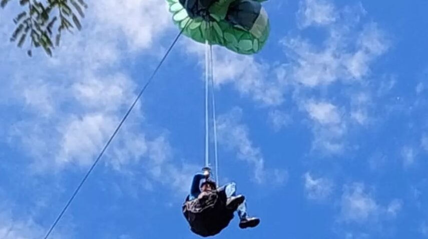 Homem salta de parapente e fica pendurado em fio de alta tensão