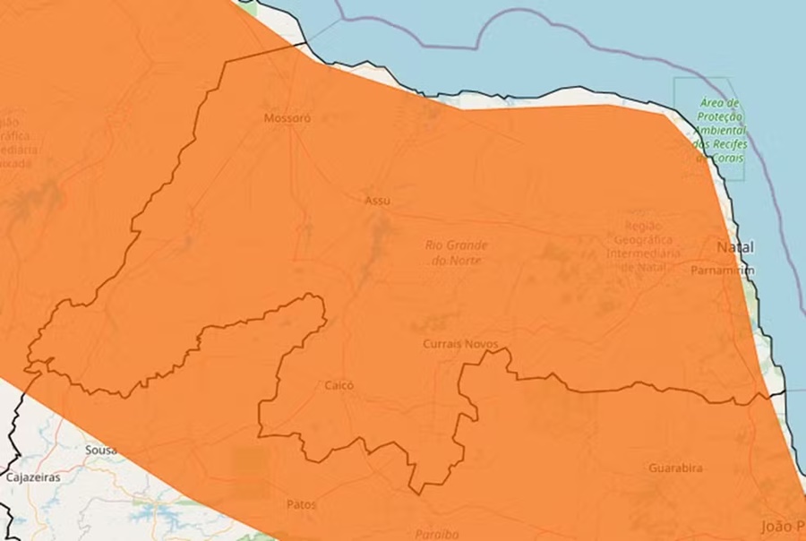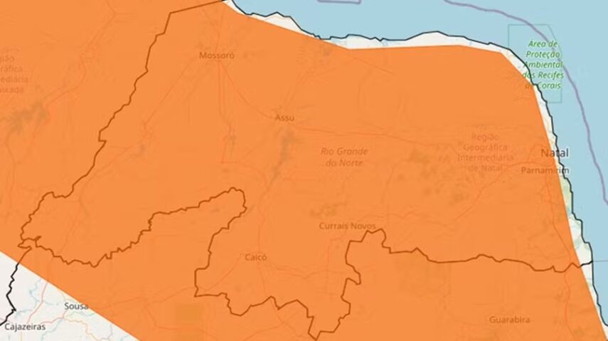 O Instituto Nacional de Meteorologia (Inmet) emitiu um alerta laranja, que indica situação de “perigo”, para todos os 167 municípios do Rio Grande do Norte nesta segunda-feira (13).