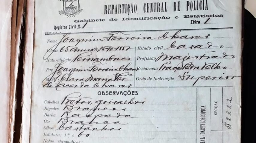 O documento destaca observações interessantes. Como não havia a inclusão do recurso da foto no registro, há detalhes da descrição física de Joaquim Ferreira Chaves Filho, como cor dos olhos, barba, bigode e até a estatura. É possível ver ainda que o registro do ex-governador foi feito quando ele já tinha 65 anos de idade.