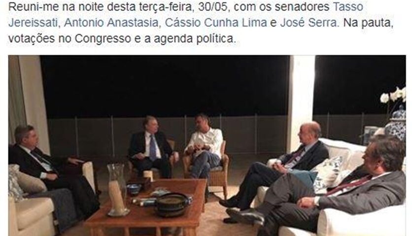 Ao reiterar o pedido, Janot citou uma postagem no Facebook feita por Aécio no dia 30 de maio, em que o senador afastado aparece em uma foto acompanhado dos senadores Tasso Jereissati (CE), Antonio Anastasia (MG), Cássio Cunha Lima (PB) e José Serra (SP), colegas de partido. “Na pauta, votações no Congresso e a agenda política”, escreveu Aécio na legenda.