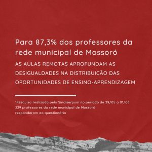 A maioria dos professores de Mossoró afirmou, em pesquisa feita pelo Sindicato dos Servidores Públicos Municipais de Mossoró (SINDISERPUM) que as aulas remotas, realizadas provisoriamente nesse período, por conta da pandemia da Covid-19 não garantem aprendizagem dos estudantes. De acordo com 83% dos professores pesquisados, as atividades on line não são efetivas para a aprendizagem dos alunos.