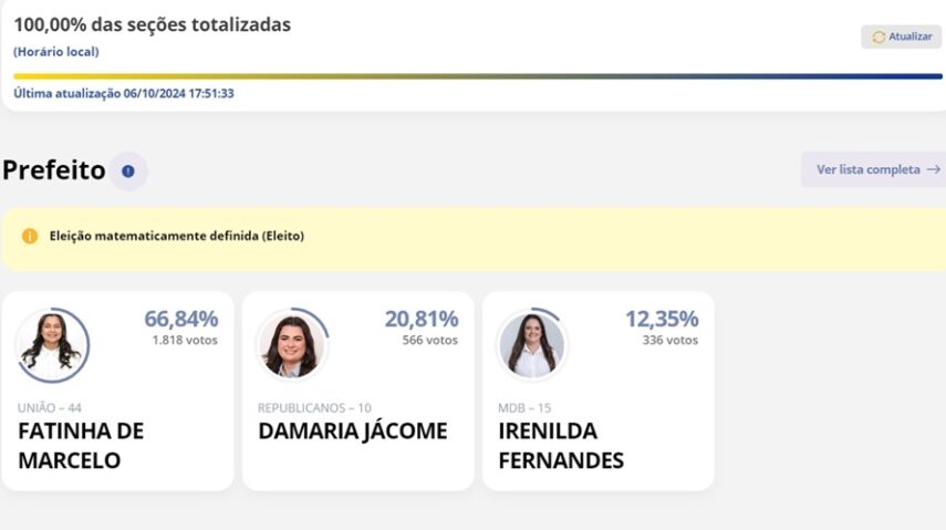 Neste domingo, 6 de outubro, Maria de Fátima Mesquita da Silva, popularmente conhecida como Fatinha de Marcelo, foi eleita prefeita de João Dias, no estado do Rio Grande do Norte. A candidata do União Brasil conquistou a preferência dos eleitores em uma disputa marcada por propostas voltadas ao desenvolvimento local e ao bem-estar da população.