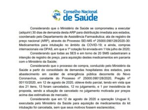 A recomendação 54 do CNS, de 20 de agosto do ano passado, faz referência ao cancelamento e menciona que a razão não foi explicada pelo Ministério da Saúde: “Considerando que em 12 de agosto de 2020 a operação Uruguai II, executada pelo Ministério da Saúde para aquisição de medicamentos do kit intubação foi cancelada, sem que seus motivos fossem esclarecidos”.