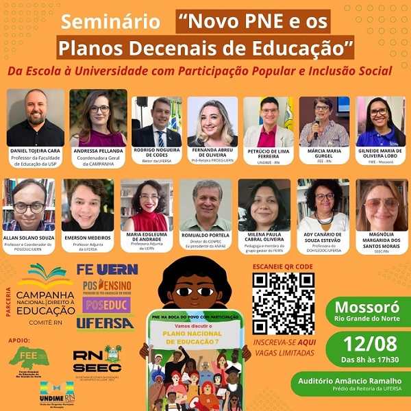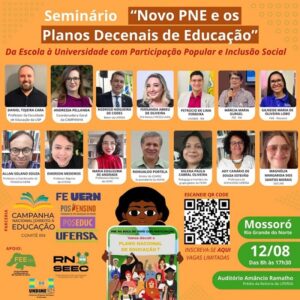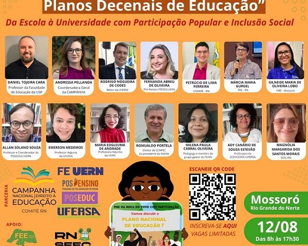 No próximo dia 12 de agosto, Mossoró será palco de um importante debate sobre o futuro da educação no Brasil. A cidade sediará o seminário “Novo PNE e os Planos Decenais de Educação: Da Escola à Universidade com Participação Popular e Inclusão Social”, uma realização do Comitê RN da Campanha Nacional pelo Direito à Educação, em parceria com a Universidade do Estado do Rio Grande do Norte (UERN) e a Universidade Federal Rural do Semi-Árido (UFERSA).