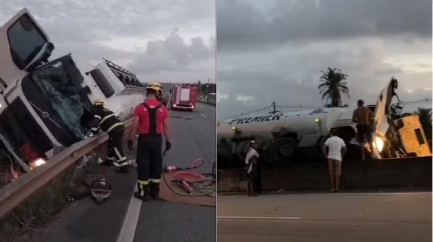 Segundo a Polícia Rodoviária Federal (PRF), o acidente ocorreu no km 145,3 da BR-101. Por causa da ocorrência, a rodovia ficou parcialmente interditada nos dois sentidos, com bloqueio das faixas da esquerda, devido à posição do caminhão, que ficou sobre as barreiras de concreto que separam as pistas.
