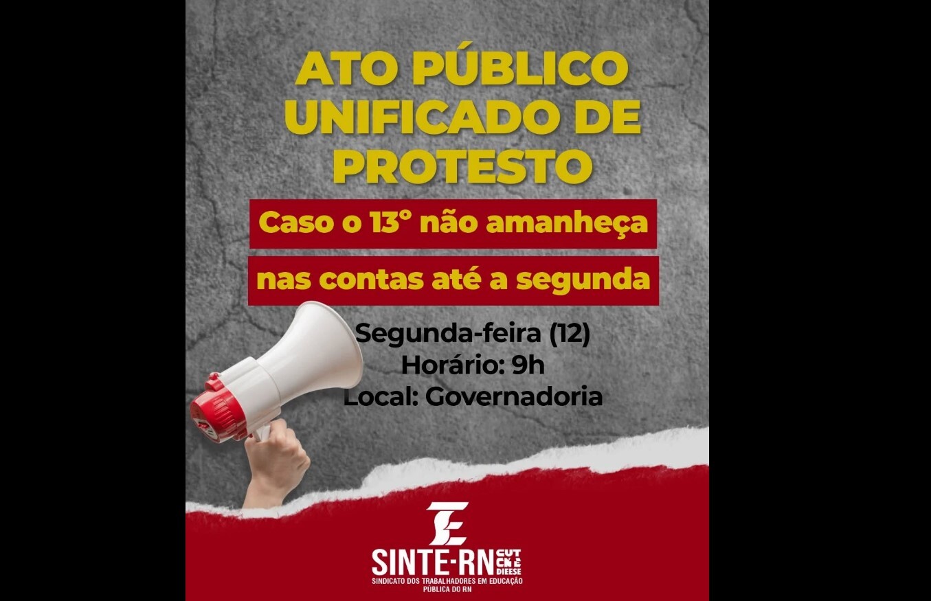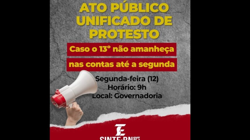 Pelo menos nove sindicatos anunciaram um ato público de protesto para a manhã desta segunda-feira (12), em Natal, após o não pagamento do 13º salário a parte dos servidores estaduais, principalmente aposentados e pensionistas. A mobilização foi convocada depois que o valor não foi depositado na sexta-feira (9), data anunciada pelo próprio Governo do Estado.