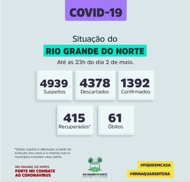 O Rio Grande do Norte tem duas novas mortes por Covid-19 confirmadas nas últimas 24 horas e chegou 61 óbitos causados pela doença. Os números foram divulgados há pouco pela Secretaria Estadual de Saúde Pública (Sesap/RN). De acordo com a Sesap/RN, o Estado tem agora 1.392 casos confirmados da doença, que é causada pelo novo coronavírus.