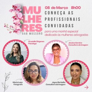 No próximo dia 08 de março, em comemoração ao Dia Internacional da Mulher, a Comissão da Mulher Advogada da OAB Subseção de Mossoró está preparando uma manhã dedicada ao autoconhecimento, saúde e bem-estar para as advogadas da região.