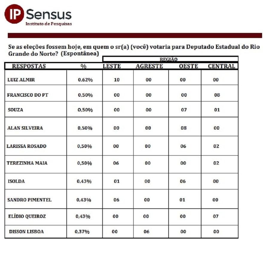Toda ação tem uma reação. Essa frase extraída da terceira Lei de Newton, se enquadra muito bem na divulgação dos resultados da recente pesquisa da IP SENSUS de intenção de votos, que aponta os 50 políticos mais contados para a Assembleia Legislativa do Rio Grande do Norte. O bom desempenho do prefeito da cidade de Apodi, Alto Oeste do estado, se reflete nesse levantamento.