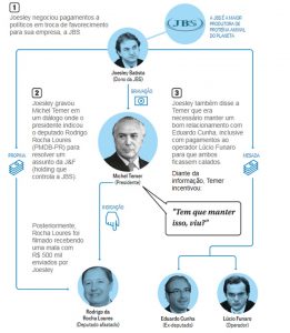 Temer também é investigado por obstrução à Justiça. O presidente foi gravado por Joesley em uma conversa no Palácio do Jaburu, que não foi registrada na agenda oficial da Presidência. No encontro, o dono da JBS disse que estava “de bem” com Eduardo Cunha na cadeia, “todo mês”, e Temer respondeu: “tem que manter isso, viu?”. O diálogo foi interpretado pelos investigadores como uma tentativa de comprar o silêncio do ex-deputado.