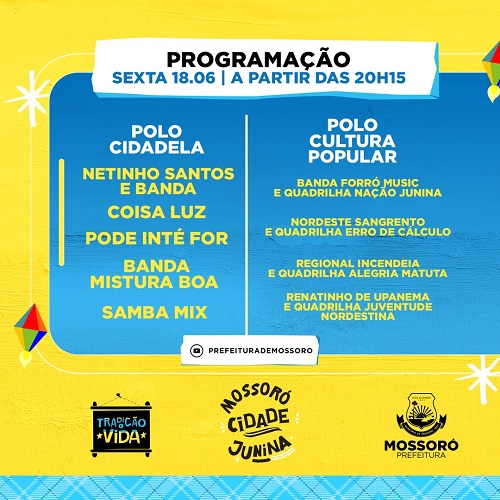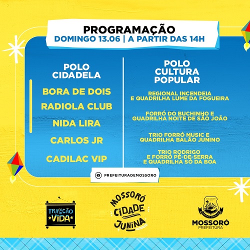 PINGO DA MEI DIA – O formato online trouxe novos elementos a uma das grandes atrações do Mossoró Cidade Junina. A apresentação das atrações feita por um casal caracterizado como brincantes de quadrilhas. Hoje as atrações foram: Nilson Viana, Beth e Jamir, André Luví, João Neto Pegadão e Giannini Alencar. A programação de hoje segue até às 17h com transmissão ao vivo pelo canal oficial da prefeitura no You Tube e a TCM.