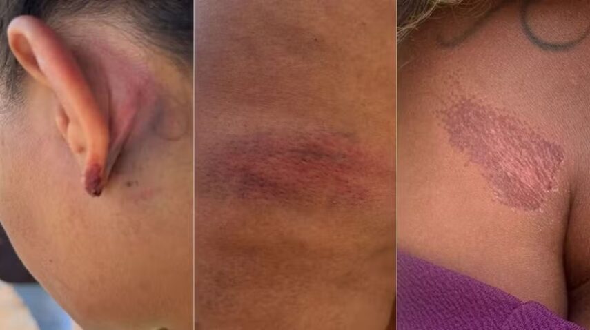 O exame de corpo de delito apontou hematomas e escoriações em várias partes do corpo, incluindo orelha, punhos, braço, coxa e joelhos.