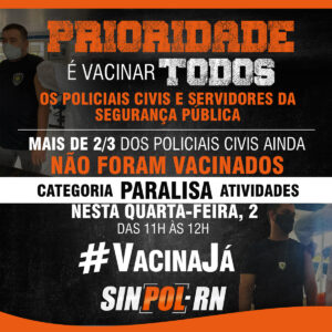 “Ao contrário do que tem sido divulgado pelo Governo RN, a vacinação dos profissionais da Segurança não tem avançado como deveria. Foi anunciado, anteriormente, que haveria priorização dos policiais na imunização. Na prática, porém, isso não aconteceu”, explica Edilza Faustino, presidente do SINPOL-RN.