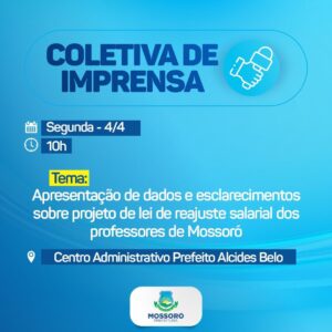 A Prefeitura de Mossoró realizará na próxima segunda-feira (4), a partir das 10h, coletiva de imprensa para apresentar em detalhes esclarecimentos sobre o projeto de lei aprovado na Câmara Municipal que concede reajuste salarial de 33,67% para os professores de Mossoró.