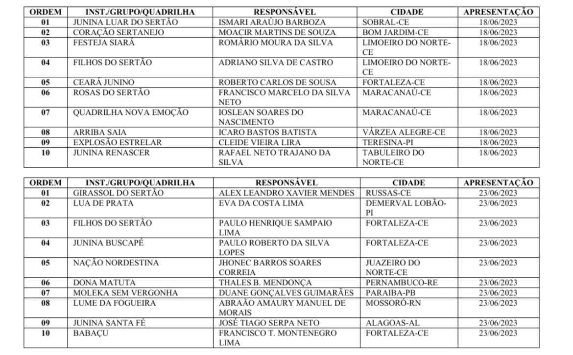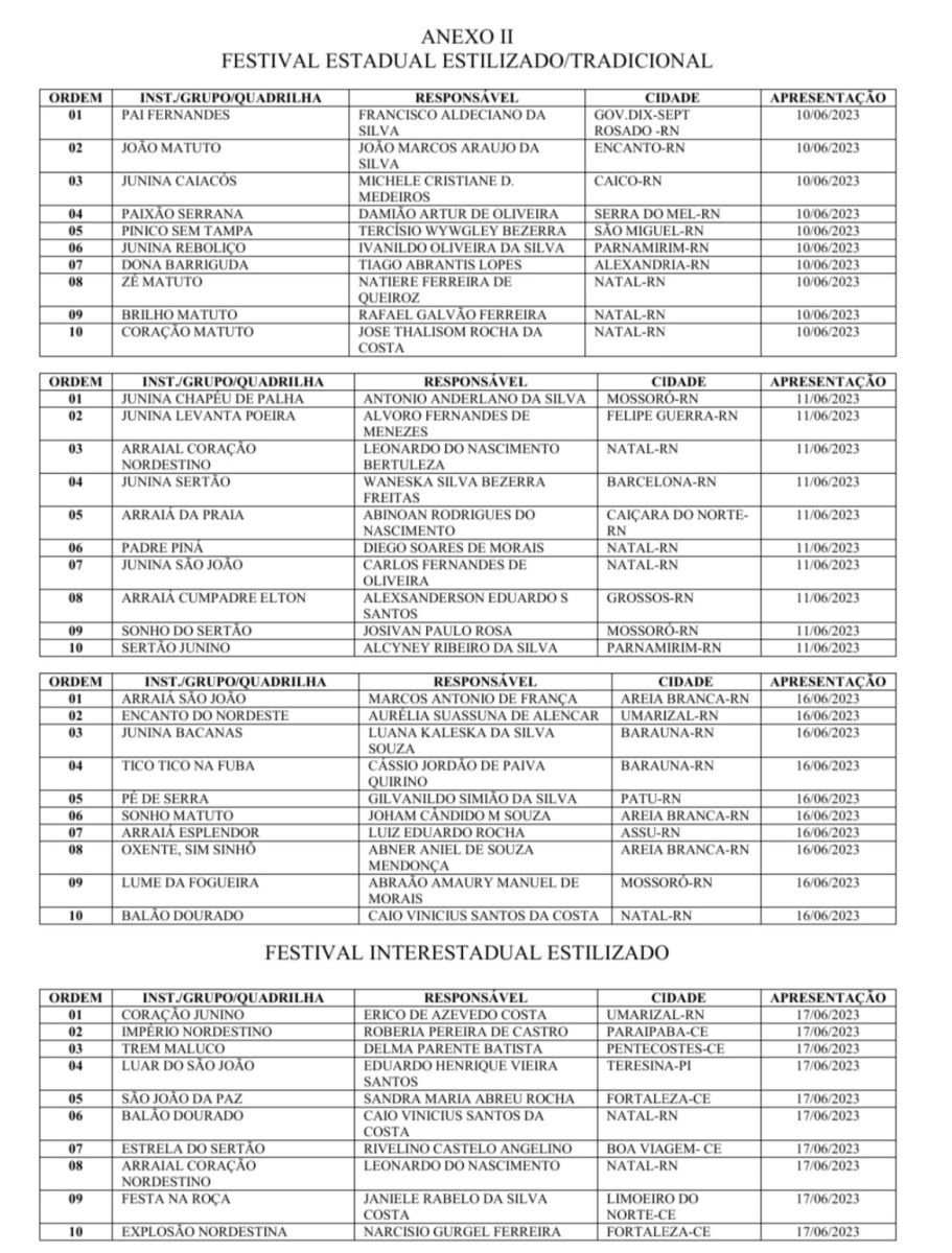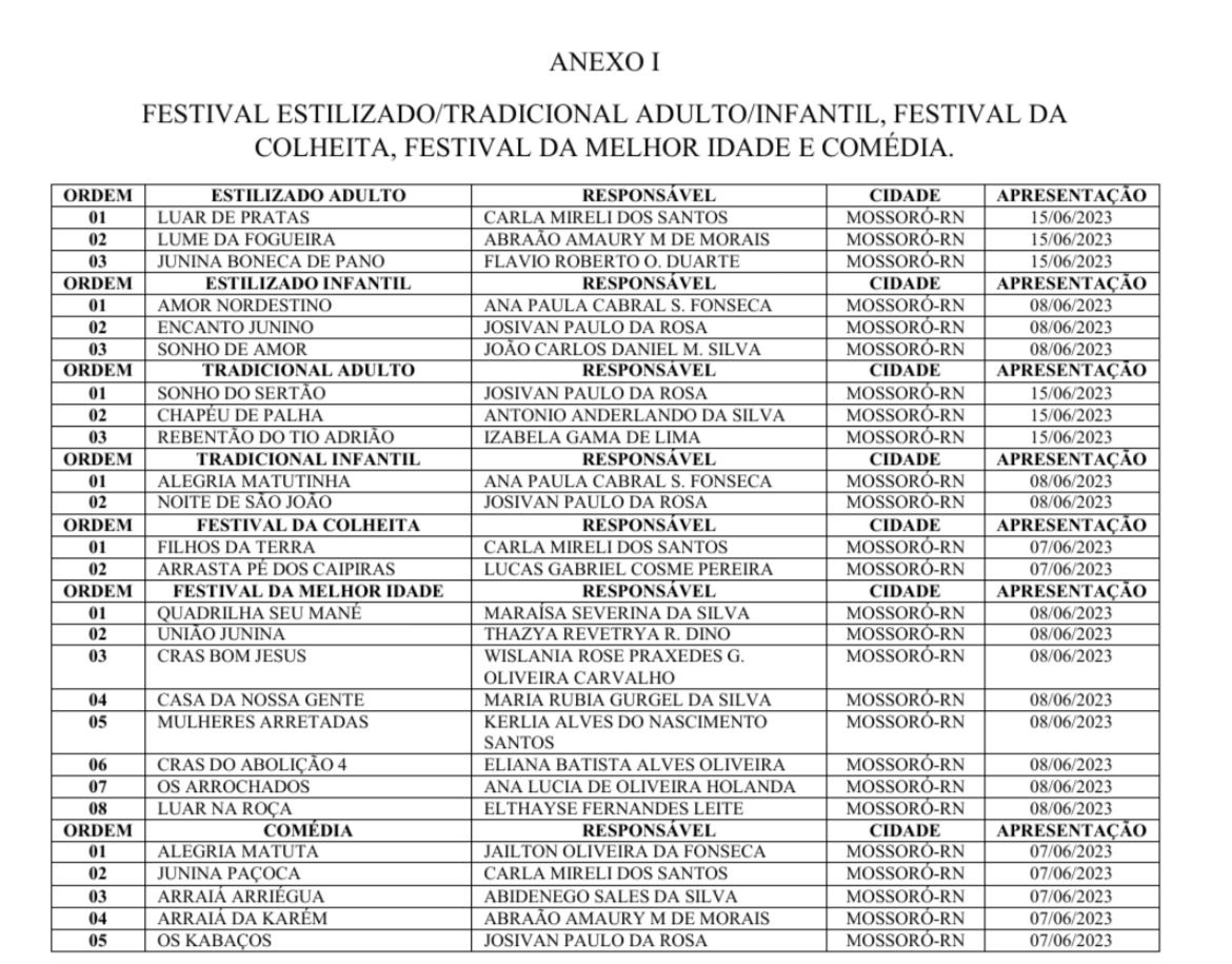 A Prefeitura de Mossoró divulgou na terça-feira (25) a ordem de participação dos grupos inscritos no Festival Independente de Quadrilhas Juninas, evento que faz parte da programação do “Mossoró Cidade Junina”. Quase 80 equipes vão abrilhantar o período junino com 172 exibições em 11 noites na Arena Deodete Dias.
