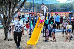 A dona de casa Janaína Torres, que reside em frente a praça, não perdeu a oportunidade de proporcionar ao filho, o pequeno Deusdete Neto, de 3 anos de idade, a alegria de brincar em um dos novos equipamentos instalados para as crianças. Ela também desfruta da estrutura pensada para os adultos.