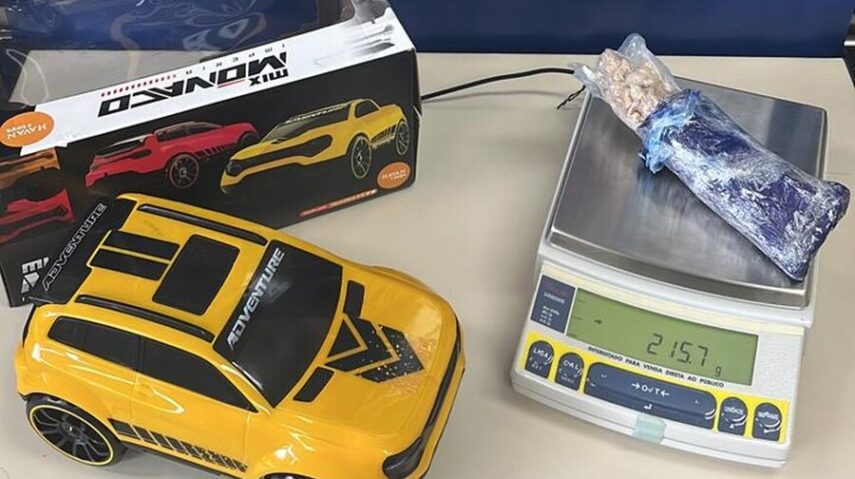 De acordo com a Receita Federal, foram apreendidas 210 gramas da substância. O momento em que a substância foi encontrada dentro do brinquedo foi registrado por profissionais da RF.