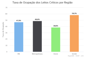 Segundo a Sesap, a Região metropolitana apresenta 48,8% dos leitos críticos ocupados, a região Oeste tem 38,6% e a Região Seridó tem 58,3%.