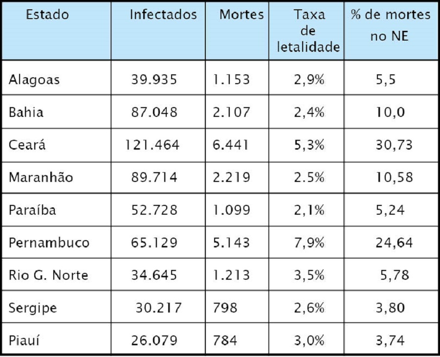 Em todo o Nordeste, já são mais meio milhão de pessoas infectadas (546.959) e 20.957 mortes causadas pela doença e o RN responde por apenas 6,33% dos registros. De forma absoluta, o Rio Grande do Norte tem o quinto maior número de mortes (os primeiros são Ceará, Pernambuco, Maranhão, Bahia e Alagoas), mas responde por apenas 5,78% dos óbitos da região. O Ceará, com 6.441 mortes, é o Estado nordestino com maior registro de vítimas fatais e também aquele que responde por maior percentual de casos (30,73% dos registros de óbitos).