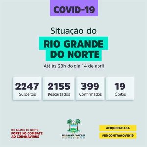 Ao todo, o estado tem 399 casos confirmados, 2.247 suspeitos, 2.155 descartados e 19 mortes. As 19 mortes no RN foram registradas nas cidades de Mossoró (6), Natal (5), Tenente Ananias (2), São Gonçalo do Amarante (2), Cerro Corá (1), Taipu (1), Lagoa de Pedras (1) e Apodi (1).